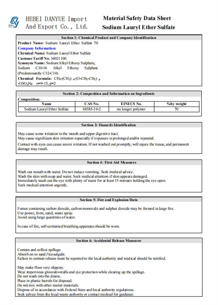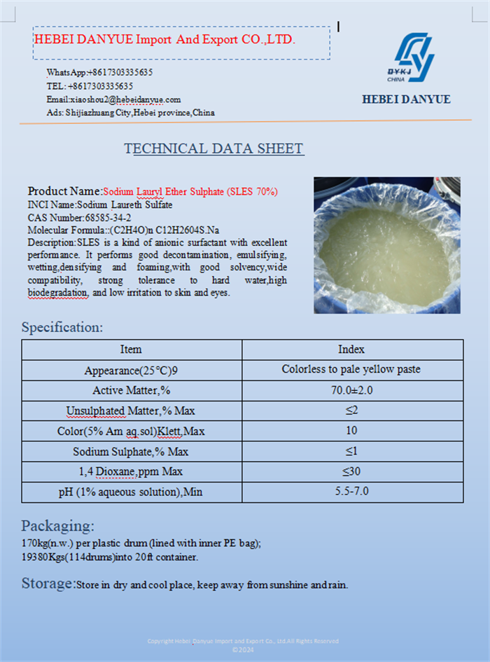 Sodium Lauryl Ether Sulfate (SLES 70%) is a kind of anionic surfactant with excellent performance. It has good cleaning, emulsifying, wetting and foaming properties. It easily dissolves in water, compatible with many surfactants, and stable in hard water. It is biodegradable with low irritation to skin and eye.